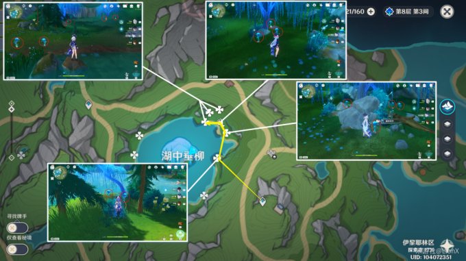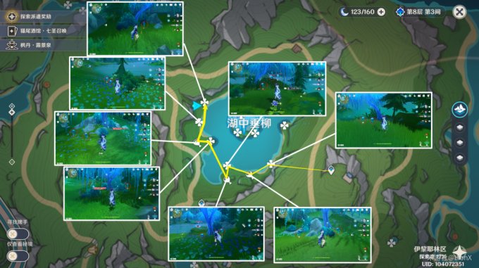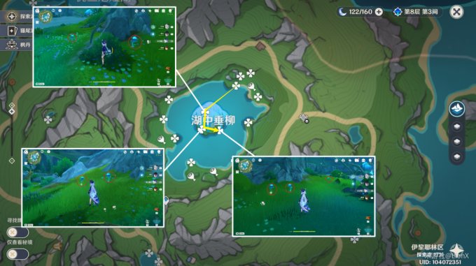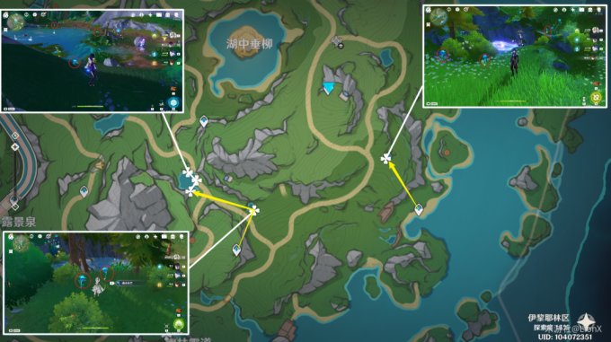 该部分路线四、路线五需要注意,标记为禽肉点位需要完成世界任务「伊黎耶的野精灵」系列任务(茉洁站喷泉处接任务),才会完全显示出来,湖中垂柳中心岛上有七个都需要完成任务才会显示。