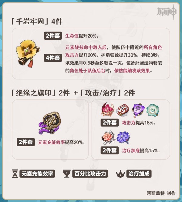 ②治疗辅助玩法的其他套装搭配可考虑“绝缘2件(提高充能)”+“攻击2件(角斗士/追忆/余响/辰砂)”或“治疗2件(海染/少女)”的2+2散搭组合。