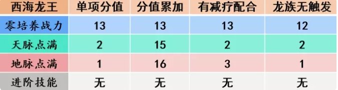 西海龙王配合小白龙同时出战,获得西海龙族效果,获得比龙族加成更高的伤害能力,可以给他二人增强大致100点伤害结果,而且西海的存在还能助力小白龙连跳,但是目前最伤心的就是,此二人尚无进阶,曾经的多龙增强伤害联动,在当今各路豪强进阶效果下,有些黯然神伤