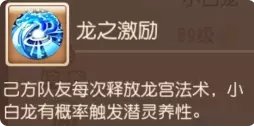 助战神技,潜灵养性,属于龙宫的清心效果,此技能不独立占用出手,小白龙出手时有50%概率进行触发