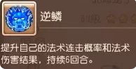 主动技能对敌人造成击败给自己加逆鳞,逆鳞会增加法术伤害结果与法连几率,大致提高对每个目标50点伤害结果,具备大致30%法连的能力,属于十分不错的技能,但是要使此技能触发,需要配合强力点杀单位协助才有可能在短期内顺利触发