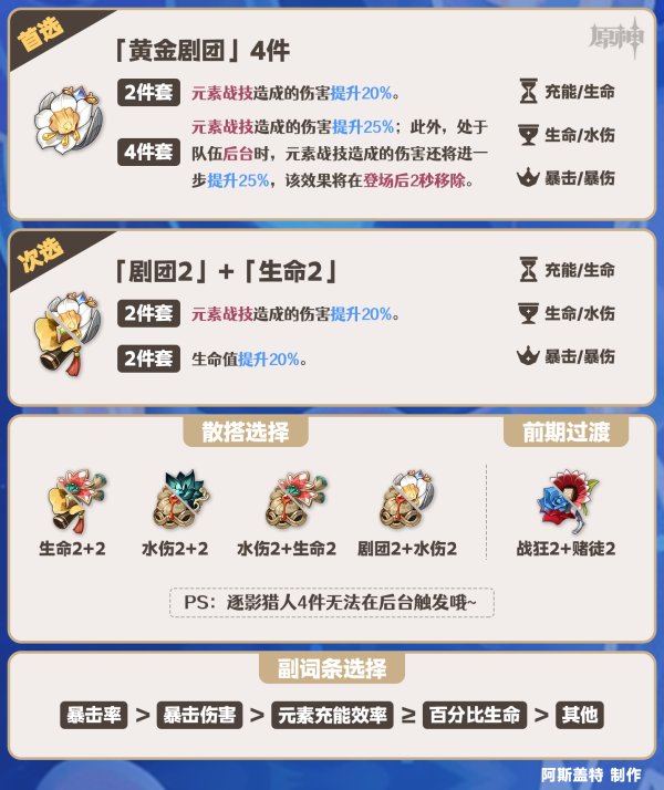 ①芙宁娜处于后台时荒性战技造成持续水伤,在大多数情况下都可考虑「黄金剧团」4件套提高元素战技造成的伤害。